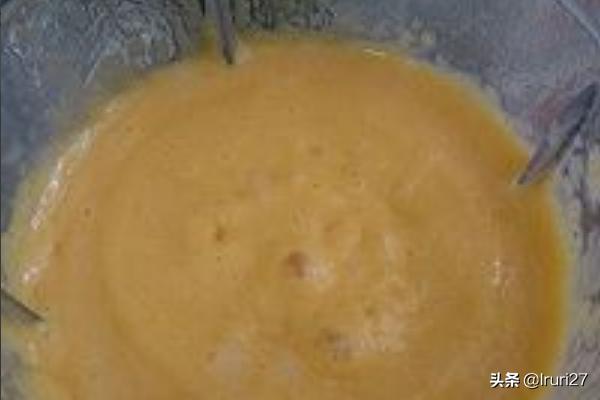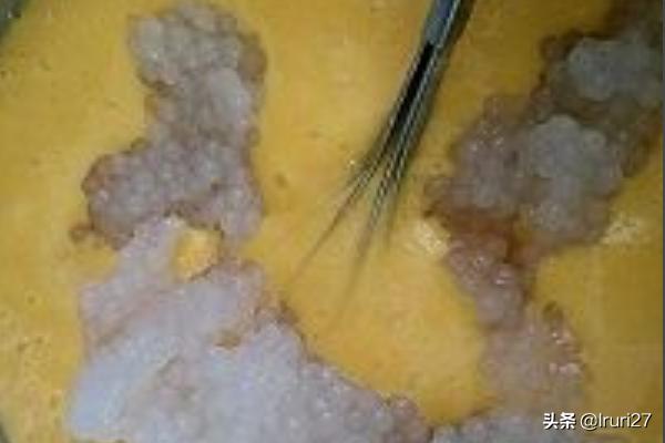 9、先把打好的杨枝甘露倒入盆中,接着倒入冰好的西米露,用手动打蛋器搅拌均匀。