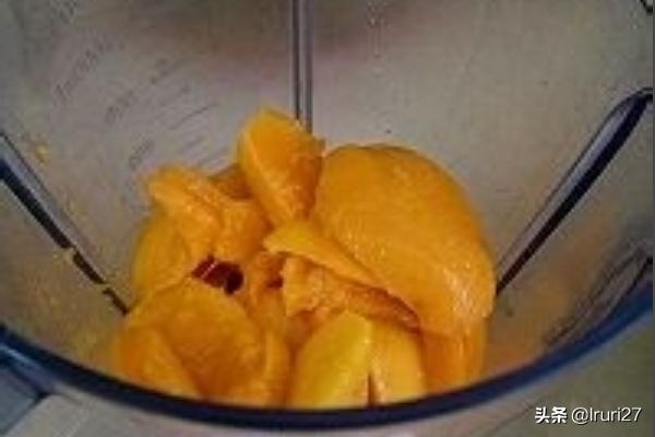 8、大概一分钟左右,打开盖子看一下,搅拌成这样略微浓稠的糊状即可。有的芒果比较甜,有的比较酸,所以杨枝甘露浆打好以后可以先用勺子盛一点点到碗里试一下,如果感觉不够甜,可以再加入一些糖粉或细砂糖然后盖上盖子再次搅拌一下,调到口感和甜度最好。如果是加细砂糖,要多搅拌一下,大概半分钟,如果是加糖粉就只需要十秒左右。
